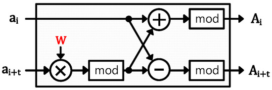 Figure 2 illustrates the block diagram of CT algorithm, which serves as a processing element (PE) in the NTT architecture. As represented in Algorithm 1, the PE operates on two polynomial coefficients, denoted as