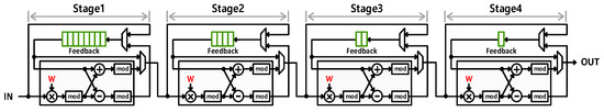 stages. Since one coefficient is received at a time, specific input coefficients need to be stored in the feedback register to be processed by the PE. These stored coefficients are operated when they come out of the feedback register. Moreover, the feedback register stores the result of the PE, indicated as