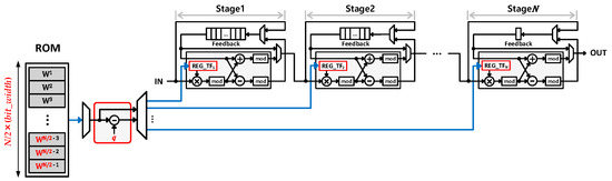Figure 3. This setup operates according to Equations (2) and (3) to perform both NTT and INTT operations. Notably, the TFG structure is designed to provide pre-stored TFs as requested, at each stage of the process. While the conventional memory-based approach offers the advantage of quick and straightforward access to TFs, it has a significant drawback: the need for a substantial amount of ROM to store the TFs and the time required to initialize this memory.
