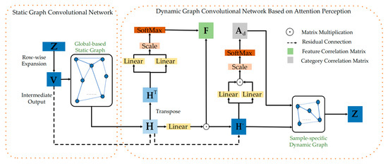 The second layer of the attention-driven dynamic graph convolutional network is based on attentional perception, introducing attention mechanism dynamic capture specific to the sample characteristics of the dimension correlation structure and label category dimension correlation structure. The static GCN intermediate output is further enhanced to obtain the enhanced category . The structure of dynamic GCN is presented in Figure 3.