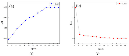 (a) The curve of the mean average precision changes with the epoch. (b) The classification loss curve changes with the epoch.