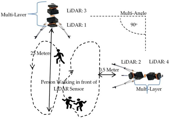 Figure 4 shows the experimental setup used in this study. We carefully arranged two stands with four distinct LiDAR sensors, each at a different height and angle. This setup ensures that data collection is effortless for everyone involved. The two LiDAR stands are positioned two meters apart, with a 90-degree angled gap between them. The LiDARs were positioned at different heights, with one six inches above the ground and the other ten inches above. The tripod holds two LiDARs, one called multilayer and the other called multiangle, which are positioned differently. Participants were given the freedom to walk naturally, showcasing their unique style and movement. Experiments were carried out during the same season and indoors. Participants moved in various directions and distances from the LiDARs, covering a range of 0.5 to 25 m. The positions of the LiDARs were considered stationary, while the participants were in motion. The experiments considered both individual walking and group walking. The analysis involved utilizing data from various sensors in different ways. We utilized UTM-30LX 2D LiDAR sensors (Manufacturer: Hokuyo, NC, USA) for this experiment. The scanning range is 30 m, and the scanner covers a 270-degree area. This sensor is perfect for outdoor use due to its lightweight design. The room’s lighting conditions were adjusted, and participants were given the freedom to move around at various speeds. Pedestrians were instructed to walk, run, or move for ten minutes as part of the research in order to collect more comprehensive and detailed data for analysis.