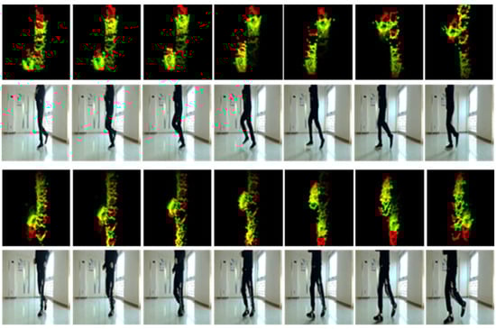 The variables are defined as follows: (x, y) represents the position, represents the time, and µ(x, y, ti) is the ankle position or motion in the present frame. The duration £ determines the temporal extent of the movement, with φ representing degradation in the images. Retaining previous images as afterimages facilitates the comprehension of time series data, resulting in the creation of the motion history image depicted in Figure 3.