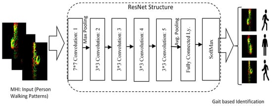 A comprehensive overview of gait-based identification is given in Figure 6. Motion history images (MHIs) were created from LiDAR data and used as input for the neural network, as mentioned before. We trained our model for the experiments and arranged a variety of techniques. The system was validated and tested using a pretrained residual neural network (ResNet-18). The network was pre-trained and subsequently utilized to train the KoLaSU dataset, comprising more than one million images sourced from the ImageNet datasets. Utilizing a pretrained network benefits from acquiring a broad spectrum of feature representations from a vast and varied collection of images. ResNet is trained to extract convolutional features using identity mapping vectors and residual learning. It is possible to specify the residuals associated with a ResNet architecture by [40].
