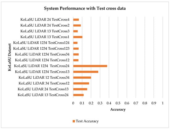 We conducted extensive testing using various datasets to evaluate the system’s performance. All fourteen datasets were considered for this cross-testing. The results were carefully analyzed, revealing a significant symmetry in the performance analysis phase that closely matched our theoretical expectations. Figure 7 provides a detailed representation of these findings. The top four datasets, namely KoLaSU LiDAR 24 and 13, show these clearly. The system was trained and validated using the same dataset, with only four cases where the test data were modified. LiDAR 24 and LiDAR 13 are created by combining sensors 2 and 4 and sensors 1 and 3, respectively. We conducted the testing using LiDAR 4 and 2, as well as LiDAR 3 and LiDAR 1 individually. The training and validation accuracy is extremely high, but unfortunately, the bar chart indicates that the test accuracy drops to less than 20%. All cases were considered using unbiased, disjointed data. The figure demonstrates that when a person undergoes proper training by the neural network and is tested under different conditions, the performance of the system will decline. All cases show consistent performance, except when the combined dataset LiDAR 1234 is tested with data 24 and 13. The performance reached 38%, but it was not particularly impressive. It is important to note that for optimal system performance, training and testing should be conducted using the same types of data. Avoiding any biases is crucial in this regard.