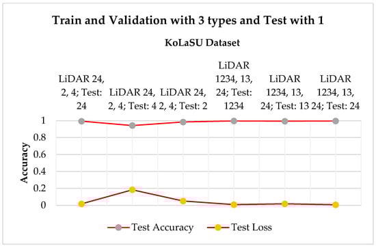 We conducted various tests on the system’s performance by combining different datasets and thoroughly training and validating our system. The accuracy we achieved was impressive in all cases. Figure 8 shows a collection of experiments conducted using combined datasets. Here, we combine the system’s accuracy and loss. Six datasets that are related to their corresponding aligned datasets. Combining LiDAR 24 data with LiDAR 2 and 4 data for the training and validation of the system could enhance the accuracy and reliability of the results. In addition, we conducted individual tests on the system using LiDAR 24, 2, and 4 data. LiDAR 1234, 13, and 24 were also used in the same scenarios. Regardless of the circumstances, the system consistently demonstrated its reliability through extensive training and testing with various datasets. The test accuracies in Figure 8 hover around approximately 99%, with a relatively low loss of less than 20%. The accuracy and loss curves also exhibit asymmetry, which suggests the performance of the network.