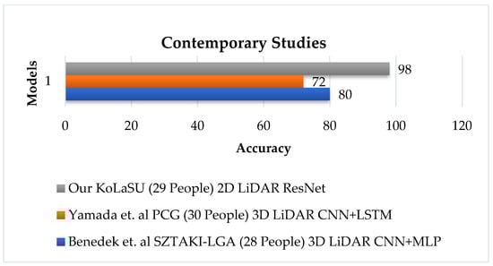 Extensive analysis was conducted during the acquisition process to ensure that the application was comprehensive and reliable across all ranges. An evaluation was conducted on both homogeneous and heterogeneous LiDAR setups for data collection purposes. The performance of the system can be compromised when the data are distributed and overlapped in a critical manner, even though a single LiDAR sensor can effectively capture the necessary data for pedestrian detection. The primary focus was on implementing a LiDAR system positioned at the ankle level to efficiently monitor and distinguish pedestrians. We have observed a diverse array of walking styles, each with its own unique characteristics. The primary obstacle we faced was the process of overlaying LiDAR data onto an image. Nevertheless, we approached this challenge with great care and carried out a series of experiments, resulting in exceptional levels of accuracy. The KoLaSU dataset includes fourteen carefully selected outdoor sequences that document the movements of twenty-nine participants. The participants were involved in a controlled experimental setup in which they walked for five to ten minutes. We chose to use a standard frame rate of forty frames per second (fps) to record the data. Regarding cross-validation, we also considered the 100 fps rate. Our datasets were carefully organized into three distinct groups for all our experiments. The data were divided into three sets: training, testing, and validation. Sixty percent of the data was allocated to the training set, while the remaining forty percent was evenly divided between the test and validation sets. Multiple stages of data segmentation were also tested. In a separate experimental trial, a substantial portion of the data, precisely 80 percent, was assigned to the training group. The remaining twenty percent of the data were evenly distributed between the testing and validation groups to ensure a thorough evaluation. The data underwent cross-validation in multiple phases to ensure their reliability and accuracy. In addition, the training data were augmented to enhance the overall performance of the system. The results mentioned above are shown in the experiments depicted in Figure 7.