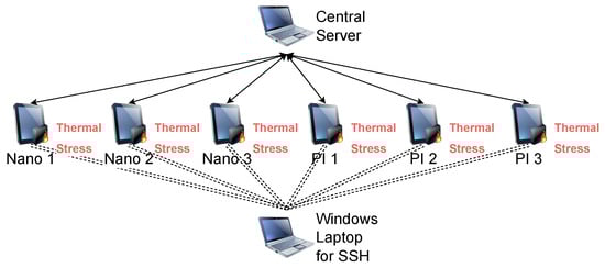 To create a real-world multi-node heterogeneous FLS and see how it performs under thermal stress, we chose to use the flower framework. In this paper, we chose three Jetson Nanos and three Raspberry PI4s as clients and a Lambda laptop as the central server, using gRPC Protocol to conduct client–server communication. We also chose another Windows laptop SSH for our six clients for the convenience of our control. Figure 2 shows the real-world picture of our FLS clients. In the left part of Figure 2, each of the three Jetson Nanos in the picture reflects one of the clients. In the right part of Figure 2, the PI4 cluster contains five PI4s in total, and we chose to use three of the PI4s within the cluster for our evaluation.