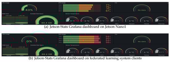 We also have another timely displayed Jetson-Stats-Grafana dashboard [23] to show the real-time utilization rate of the CPU, GPU, TOT, and other metrics. The dashboard first collects Jtop-gathered data using a certain API provided and uses certain scripts to regulate data into certain forms that can be accepted and then transfer those data to the host running Prometheus [24]. Then, it has another host running Grafana [25], which is the platform for our dashboard. By importing certain dashboard distribution files and pulling data from Prometheus, Grafana can offer a timely display of utilization rates in certain metrics. We also modified the Jetson-Stats-Grafana dashboard for it to fit our Jetson Nano clients. As for Raspberry PIs, Glances comes with an easy-to-read dashboard. Figure 3 shows our Jetson-Stats-Grafana dashboard on Jetson Nano1 without any other program running, and Figure 4 is the dashboard of our FLS clients while training the local model.