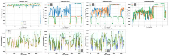For power consumption, as shown in Figure 7, normal Jetson Nano clients running federated learning system training rounds typically consume between 4500 mW and 5000 mW while working. Power consumption can drop to 2000 mW when these clients are running evaluations or waiting for other under-stress clients to finish their training. However, clients under thermal stress tend to consume more than 5000 mW, fluctuating between 5000 and 9000 mW and sometimes reaching 10,000 mW, or even 12,000 mW. From Experiments 4 to 7, we can see that under the same thermal stress, Nano 3 consumes more power than Nano 1 or 2, possibly because Nano 1 and 2 have fans while Nano 3 does not. When both PIs and Nanos are under thermal stress simultaneously, Jetson Nanos, being less affected by thermal stress than PIs, also tend to experience power consumption drops while waiting for the PIs to finish their training rounds.