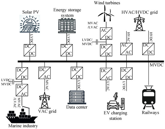 The expansion of MVDC networks, ranging from 1.5 to 55 kV, presents a crucial solution for creating a cleaner energy landscape by addressing and mitigating challenges encountered in the transition towards transportation electrification, integrating renewable energy sources such as photovoltaic (PV) and wind, and implementing energy storage systems [1,2,3,4,5]. For example, it is known that the transportation industry, responsible for nearly 36% of total energy expenditure, is shifting towards electric vehicles (EVs) to reduce emissions of harmful greenhouse gases [6]. This shift, marked by a significant increase in EV production and the expansion of the global EV fleet, highlights the urgent need for an enhanced EV charging infrastructure to match the growing demand. Figure 1 illustrates the role of an MVDC network in addressing this challenge, notably through the integration of the railway system, renewable energy, energy storage resources, and EV charging stations, among others [1]. One innovative aspect involves capturing and repurposing the kinetic energy generated during train braking—a process that would otherwise waste this energy—by providing supplemental power to EV charging stations located near railway stations [7,8,9,10]. This approach not only conserves energy but also promotes the adoption of EVs and the integration of renewable energy sources into the electrical grid, thereby creating a more flexible and resilient energy system capable of adjusting to varying supply and demand conditions.