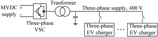 To supply power to low-voltage AC (LVAC) equipment and loads, such as an AC EV charging station, from an MVDC source (e.g., a DC railway traction system), several topological options are available. Thanks to rapid advancements in power electronics components and systems, which have enabled the development of efficient MV converters, employing high-power MV DC-AC converters emerges as a practical alternative [11]. The choice of converter—whether a conventional H-bridge or multilevel power converters including the neutral point clamped inverter, the flying capacitor multilevel inverter, or cascaded H-bridge inverters—depends on the MVDC voltage level and several key factors, including power quality, efficiency, and system complexity [12,13,14]. Regardless of the chosen topology, a step-down transformer is beneficial at the converter’s output to lower the voltage to an LVAC level. With an appropriate design and vector group selection, this transformer can also block zero sequence currents from passing through, prevent DC injection by the converter, provide single-phase loading on the secondary side, and also serve as the output filter inductor for the converter. Furthermore, to complete the LC filter for the converter, a capacitor is necessary on the secondary (LV) side of the transformer. Using the capacitor on the LV side offers several advantages: it eliminates the need for expensive high-voltage sensors, reduces insulation requirements, and minimizes overall cost. Figure 2 illustrates this configuration for clarity, with three-phase AC EV chargers as the load.