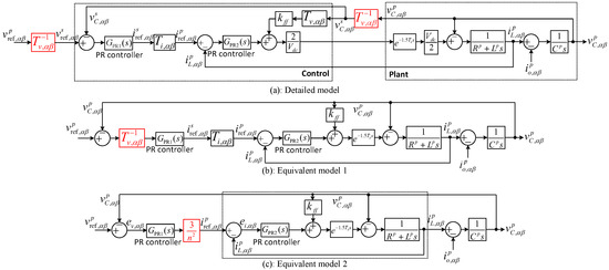 It is known that an integrator in the frame mathematically corresponds to what is known as a reduced-order generalized integrator, also referred to as a complex integrator in the frame [24,25]. Here, j represents the complex operator, and is the angular frequency of the frame’s rotating angle. Consequently, a PI controller in the frame, expressed as , corresponds to a Proportional–Complex–Integrator (PCI) controller in the frame. Given this correspondence and the fact that and , the equivalent -frame representation of Figure 7a can be derived as illustrated in Figure 7b.