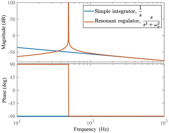 For frequencies higher than the fundamental frequency , a resonant controller and integral controller have very close frequency response (see Figure 8). Therefore, for the sake of simplicity, the resonant regulator in the above transfer function can be replaced by a simple integrator. In this case, we obtain: