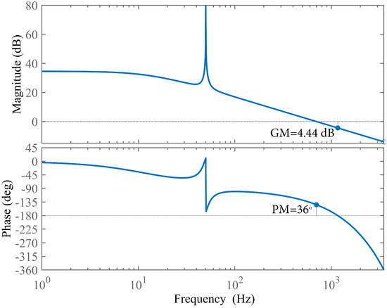 Figure 9 shows the Bode plot of the open-loop transfer function (13) with the designed control parameters. It is observed that both the Phase Margin (PM) and Gain Margin (GM) of the control loop fall within the recommended ranges of 30–60° and 2 to 10 dB, respectively, and are therefore considered satisfactory. Interestingly, the open-loop gain crossover frequency occurs exactly at the targeted value of 700 Hz, which further confirms that the approximation made for obtaining (14), replacing the resonant controller with an integral one, is accurate.
