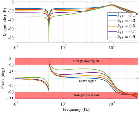 Figure 10 displays the Bode plot of (17) for different values of the feedforward gain . It is observed that increasing the value of expands the passivity frequency region at high frequencies. However, this results in increased nonpassivity around the fundamental frequency. Therefore, a trade-off decision must be made. In this work, is selected. It is noted that leads to significant nonpassivity around the fundamental frequency and is, therefore, not recommended.