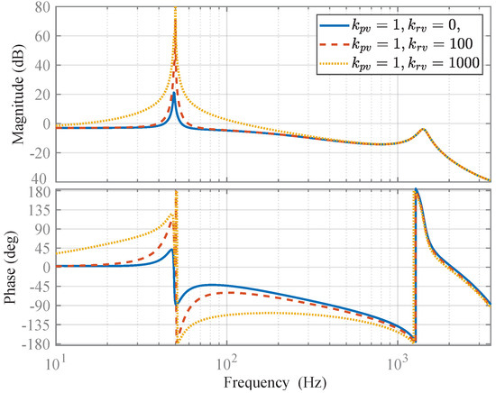 Bode plots of the open-loop transfer function of the voltage control loop, (18), with the proportional gain () fixed at 1 and varying resonant gains () of 0, 100, and 1000.