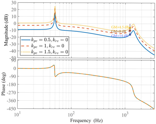 Bode plots of the open-loop transfer function of the voltage control loop, (18), with the resonant gain () fixed at 0 and varying proportional gains () of 0.5, 1, and 1.5.