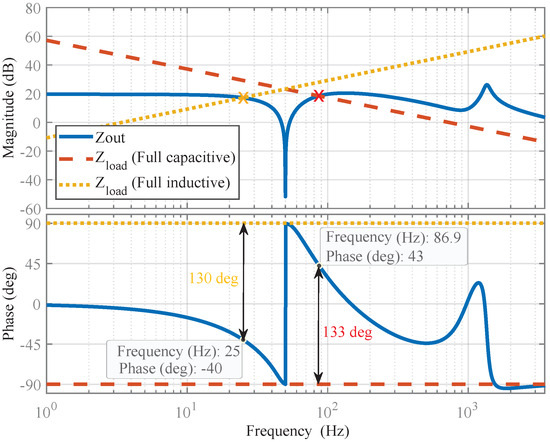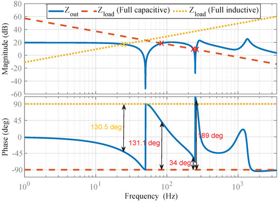 Now, an alternative scenario is explored, in which a parallel ideal resonant regulator, centered at the fifth harmonic frequency, is connected in parallel with the PR controller () in the voltage control loop in Figure 3. This parallel resonant regulator functions as a harmonic compensator, effectively reducing the THD of the VSC output voltage when powering nonlinear loads. In this case, the Bode plot of the output impedance of the VSC will be as shown in Figure 14. Regarding the inductive load, the situation closely resembles that depicted in Figure 13, suggesting that the incorporation of the fifth harmonic resonant regulator does not affect the VSC stability with a 1 p.u. inductive load. However, with a capacitive load, the dynamics change; we identify three intersection points, with phase differences of 131.1°, , and . Importantly, the phase difference at the third intersection point surpasses , indicating a negative PM and, thus, instability for the VSC when connected to a 1 p.u. capacitive load.