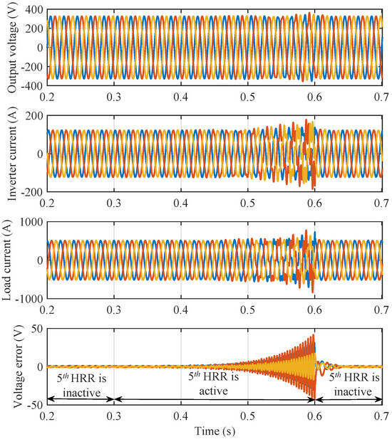 To confirm the aforementioned observation, a 1 p.u. (250 Mvar) capacitive load is connected to the VSC. Initially, the VSC begins to supply power to the load without the fifth Harmonic Resonant Regulator (5th HRR). At a certain point, this harmonic resonant regulator is activated, and after a brief period, it is deactivated. As shown in Figure 15, the activation of the 5th HRR destabilizes the VSC. It is also observed that the VSC regains stability after its deactivation. The above observations confirm the theoretical predictions, which are based on the obtained small-signal model for the VSC. These observations directly validate the model’s accuracy and reliability. The validity of the model can also be demonstrated in a similar manner for the case of an inductive load, but to save space, detailed results are not presented.