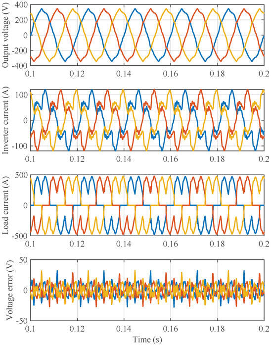 The unbalanced load test for a three-phase grid-forming VSC is essential, as it reflects real-world scenarios where loads are not uniformly distributed across phases. For this purpose, a full load (0.64 ) is connected to phase A, while phases B and C carry no load. It is important to note that the Wye point neutral in the transformer’s secondary winding serves as a connection point for single-phase loads on the secondary side. The outcomes of this test are presented in Figure 20. Remarkably, the output voltage remains perfectly balanced, and the voltage tracking error is zero, even under such an extremely unbalanced loading condition.