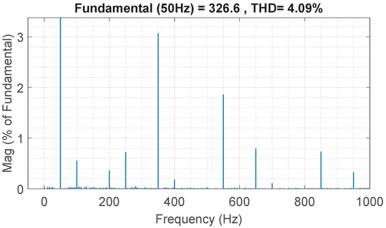 Now, the converter performance when supplying a diode bridge rectifier load is investigated. For this test, a full-bridge rectifier load (R = 1.5 and mF) is used. As demonstrated earlier, an ideal 5th HRR can result in instability. Therefore, a damped 5th HRR is used in the converter control system hereafter. This ensures that the converter output voltage THD remains low under nonlinear load conditions and that the converter output impedance around the fifth harmonic frequency remains passive. The obtained simulation results are shown in Figure 16, and the converter output voltage spectrum and THD is illustrated in Figure 17. Despite the high harmonic content of the load (around ), the output voltage maintains a low harmonic content of around 4%, which confirms the effectiveness of the converter when supplying nonlinear loads.