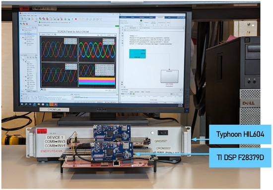 The controller is deployed to a Texas Instrument DSP F28379D using code generation (C2000 Microcontroller Blockset on Matlab Simulink). The DSP runs at 200 MHz and is configured to switch and sample synchronously at 7 kHz. This means that each time the ePWM counter reaches its maximum count, the ePWM1 module triggers a Start of Conversation (SoC) interrupt in one of the ADC blocks. Once the ADC conversion is finalized, the End of Conversion (EoC) interrupt is triggered, and the controller subsystem is executed. To operate the converter, three ePWM modules are needed, where each module can generate two PWM signals, ePWMA and ePWMB, which are configured to drive the upper and lower switches of one of the converter’s three legs. The deadband unit of the three ePWM is set to generate a 10 s deadtime to avoid short-circuiting the input power supply. Finally, the PWMs are sampled by the HIL ADCs at a 50 MHz rate, which allows testing the controller with high fidelity.