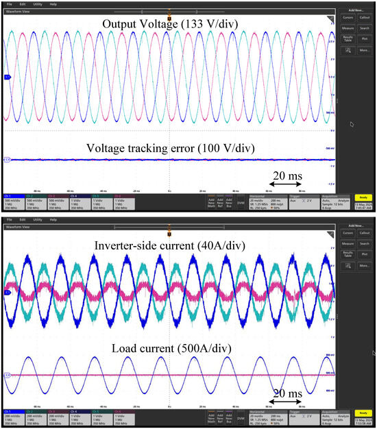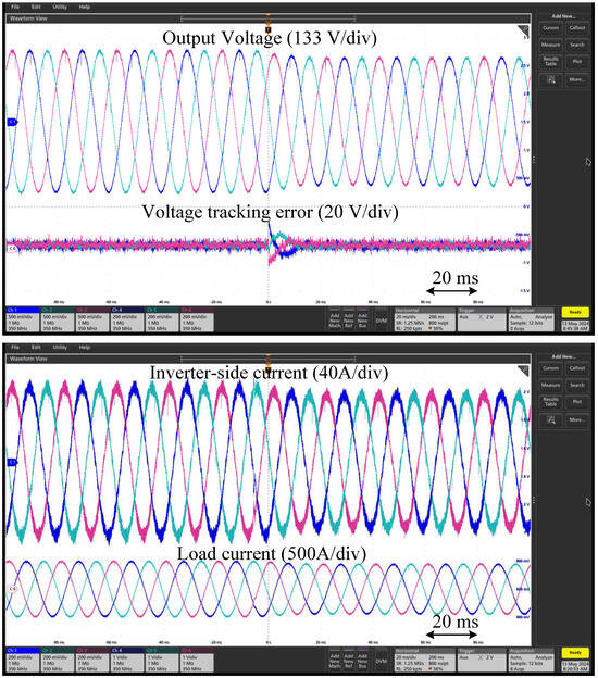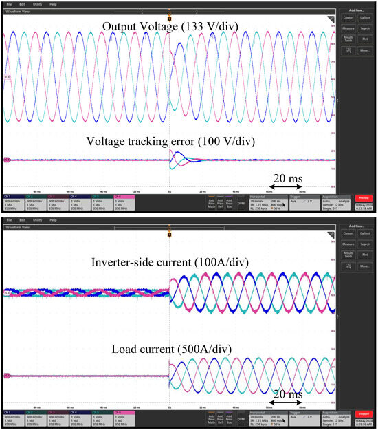 Figure 19 presents the results, showing that the output voltage total harmonic distortion (THD) remains low under both no-load and full-load conditions, at and , respectively. Furthermore, the VSC exhibits an excellent dynamic response, with the tracking error converging to zero in fewer than two cycles of the fundamental frequency.