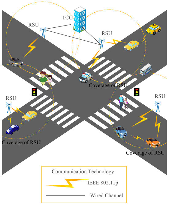 Figure 1 illustrates the system architecture within the scope of a single TCC. Communication between vehicles, as well as between vehicles and RSUs, is achieved through open dedicated short-range wireless signals, while communication between RSUs and between TCC and RSUs is performed through wired communication.
