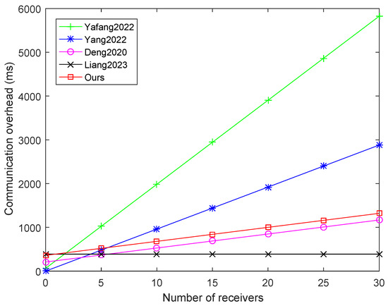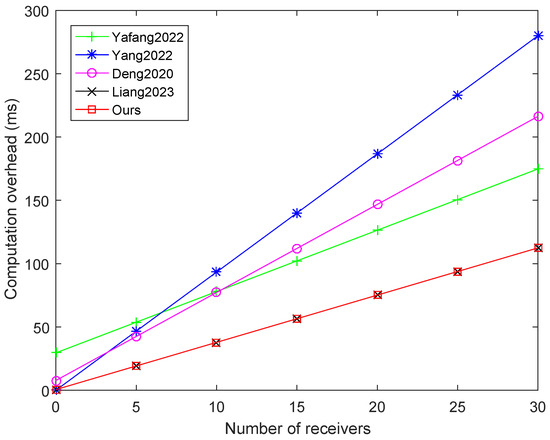 Also, Table 4 shows the total computation cost of each algorithm, respectively. The experimental comparison is depicted in Figure 2, where the number of receivers has increased from 0 to 30. This figure evidently shows that our scheme has apparent advantages over schemes Yang et al., 2022 [8], Yang et al., 2022 [13], Deng 2020, [17]. The efficiency of scheme Liang et al., 2023 [18] is similar to that of our scheme, but its receivers are limited to RSUs, while the receivers of our scheme can be both RSUs and vehicles, with greater flexibility.