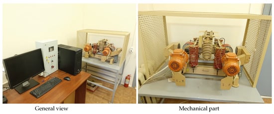 A vibration complex SV-2M is a nonlinear electromechanical system equipped with two induction motors (IMs) with unbalanced rotors []. The photography of the set-up SV-2M is depicted in Figure 1. The photo on the left gives a general view of the complex, which includes a control computer with a monitor, a power supply unit for the stand with electronic components, and the mechanical part of the setup, bounded by a fence. This unit is shown in more detail in the photo on the right, which shows two induction motors with unbalanced rotors mounted on a massive base and a spring-loaded working platform.