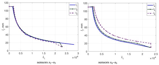 Since the measurement characteristics of optical sensors s1, s6, given by , , are close to the inversely proportional mappings presented in Figure 2, the displacements , at times ,  of the corresponding platform points s1s6 are restored based on the sensor readings. Before the experiments, optical sensors position had been calibrated to obtain their real measurement characteristics and the results were tabulated in 20 points inside the working range (see Figure 2). Sensor measurements sometimes include random spikes, which are erroneous readings outside the normal range. Therefore, these anomalies were removed before further processing. For this purpose, each sensor’s entire array of measurements was subjected to statistical analysis using partitions the values of  into M bins, and returning the count in each bin.  bins was set for data processing. Next, values that occur in the measurement array less than the specified threshold value  are selected ( was set) and are replaced by the arithmetic mean of the measurement array. To recover displacement values  from sensor signals , an spline-interpolation procedure was used on the every data processing step .