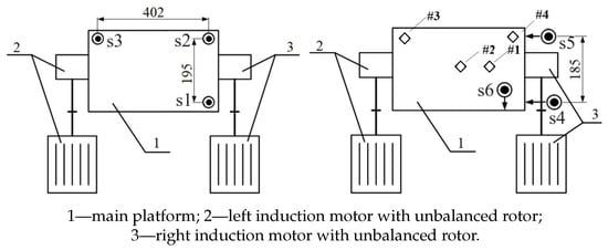 The sensors’ nomenclature is as follows. Optical motion sensors DFRobot Smart Grayscale Sensors are installed for obtaining information about the linear and angular coordinates of the 6-degrees-of-freedom platform. In the SV-2M, the analog sensor outputs are used, which are fed to the analog I/O board PCI826 for transferring measured data to the PC. Measuring characteristics of sensors are demonstrated in Figure 2 as mappings of distances between the basement and the corresponding points of the platform ,  to the digital numbers at the outputs  of the corresponding channels of the PCI826 driver, which transferred to the computer. The location of linear displacement sensors on the main platform is shown schematically in Figure 3. Sensors s1–s3 measure the position of the main platform in the vertical plane, and sensors s4–s6 measure its position in the horizontal plane; sensors s4 and s5 measure displacement along the X axis, sensor s6 measures displacement along the Y axis. In Figure 3, the numbers #1 …#4 indicate the points of interest for the following study of the platform vibrations. In Figure 3, numbers #1 …#4 indicate the points of interest of the platform for the succeeding study of its vibrations. Two velocity sensors with Autonics E30S4-1000-6L encoders, having a resolution of 4000 pulses/revolution, are mounted for measuring rotation angles ,  of unbalanced left and right (conventionally) rotors.