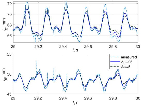 As an example of the described procedure application, consider the case of filtering data of , , obtained for  rad/s,  rad/s, , taking  rad/s,  rad/s, and  rad/s. The resulting time histories for ,  along with  are depicted in Figure 4. The graphs obtained for different values of  show the influence of this parameter on the result of measurement filtering. The choice of frequency filter parameters is always a compromise between noise alleviation and possible signal distortion in the area of essential frequencies. The decision is assigned to the researcher, making it based on the study of processes for specific conditions.