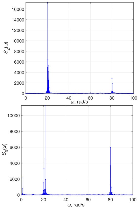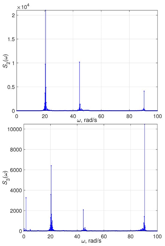 Additionally, similar experiments were performed for the case of different rotation frequencies of rotors. Namely,  rad/s and  rad/s were taken (i.e., in (3)–(10) parameter  was set). The desired phase shift between the rotors  is set to zero. The corresponding spectral densities for centered displacements ,  of sensors #2, #3 are pictured in Figure 7. As is seen from the plot, the spectrograms have three peaks: on the frequencies of 45 rad/s, 90 rad/s, corresponding the rotation velocities of the drives, and the peak on 20 rad/s appears related to the natural oscillating of the platform.