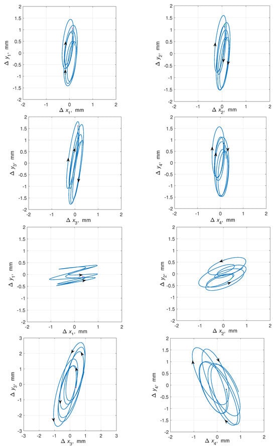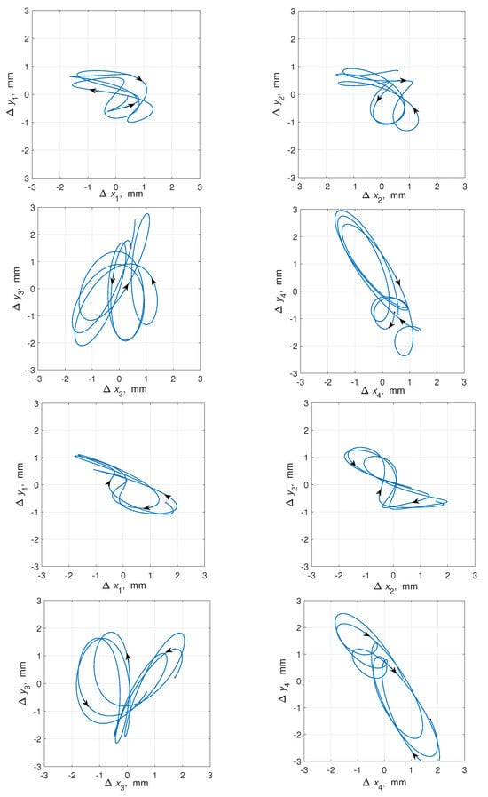 The corresponding vibration fields of the platform sections #1–#4 on the vertical plane  are plotted in Figure 8. The time interval for plotting the curves is taken as  s. This interval corresponds to six periods of motion with a frequency 90 rad/s. The platform motion is for the considered multiple synchronization case, which is more complex compared with the single-frequency one due to interference both from the slow oscillations with the natural frequency of the platform (20 rad/s) and two rotation speeds of the drives with different values (90 and 45 rad/s).