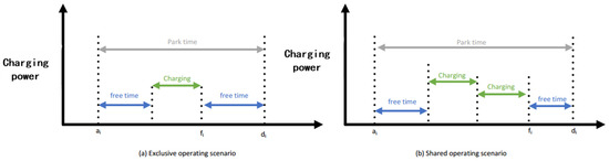 The scenarios (exclusive and shared) in the paper are modeled based on real-world application scenarios. In reality, some CSs use all-in-one charging stacks, which typically have a fixed power output and are less flexible. This inflexibility often leads to inefficiencies in power utilization and higher operational costs. Other CSs use split charging stacks, which can provide flexible power distribution and automatically adjust the output power of each interface according to the number of connected electric vehicles. Two operational scenarios of charging power are shown in Figure 1.