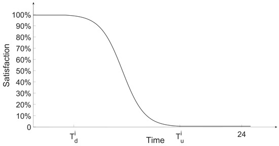 - High commercial demand (Q = 90%): In this business model, each arriving EV i should satisfy its energy demand at a time close to its lower limit , which is equivalent to satisfying its charging demand immediately upon arrival at the station. In practice, this is equivalent to expensive customer service.