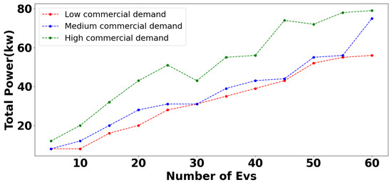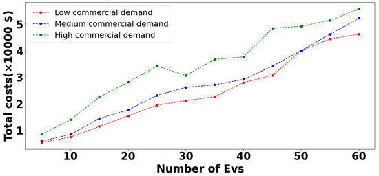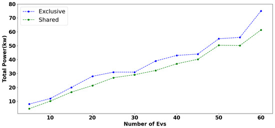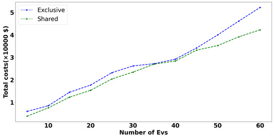 The impact of the various models on CS investment costs is investigated, and Figure 3 shows the results for medium commercial demand. As shown in Figure 3, the shared model has lower investment costs than the exclusive model. This is because, in the shared operation scenario, an intelligent charging strategy is used to ensure that each electric vehicle has a specific charging rate (satisfying constraint (14)) and allow more vehicles to charge. In this way, it can effectively reduce operating costs by using low-power charging facilities. Furthermore, this difference increases as the number of EVs increases, indicating that it is indeed important to consider different CS charging strategies in the task of CS sizing, especially as the popularity of EVs increases.
