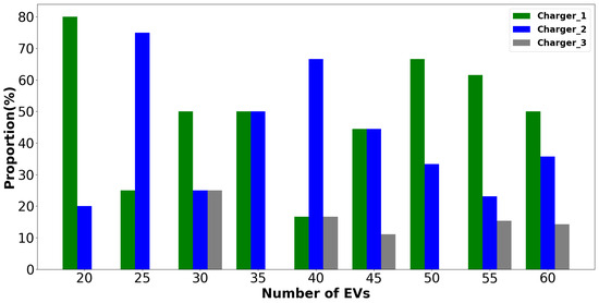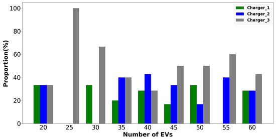 Figure 5 shows the allocation ratios of different EV charging facilities under different EVs in an exclusive scenario, while Figure 6 shows the results in a shared scenario. In the exclusive scenario, the CS mainly uses level 1 and level 2 EV charging facilities, while, in the shared scenario, due to its flexible power distribution, the CS mainly uses level 3 EV charging facilities. In addition, due to the inability to freely allocate power in the exclusive scenario, more EV charging facilities may be needed to charge EVs. Finally, it is found that, regardless of the scenario, the algorithm tends to select some level 1 and level 2 EV charging facilities in most cases. This is because having more EV charging facilities still has benefits, as it provides more options for the initial allocation of EV charging facilities in EVs, thereby improving the user’s charging experience.