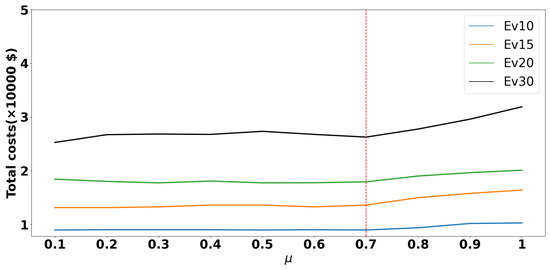 Figure 9 examines the relationship between the shared threshold and the station investment cost. The results show that the value of the shared threshold is not necessarily higher, as the station investment cost is related to the user’s charging satisfaction function. When users share more power, the charging completion time is longer, which leads to higher station investment costs to achieve the corresponding business demand model. This situation is more pronounced when is greater than 0.7.