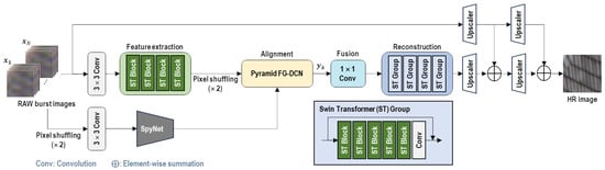 Given multiple noisy RAW images as input, BSRT aims to generate a denoised, demosaicked, and super-resolved RGB image as output. The process pipeline of BSRT is shown in Figure 1. The input images are N 4-channel RAW images. First, they are 2× upscaled to 1-channel ‘RGGB’ images by pixel shuffling and converted to 3-channel RGB images by a 3 × 3 convolution. Letting one of them be the reference frame, the optical flow between the reference frame and each frame is obtained by a pre-trained SpyNet. Meanwhile, the original RAW images are sent to several Swin Transformer blocks to extract features. Then, the feature maps are 2× upscaled by pixel shuffling as well. The feature maps are aligned to the reference frame’s feature map using the Pyramid FG-DCN alignment module with the preacquired optical flows. After that, these aligned feature maps are fused by a 1 × 1 convolution and passed through several Swin Transformer groups to reconstruct the HR image.