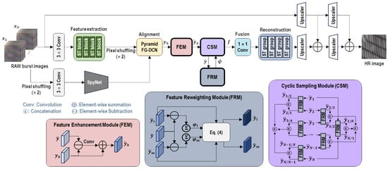Here, is the concatenation operation with ; denotes FRM that will be explained in Section 3.3. The final feature map f is sent to the 1 × 1 convolution operation for fusion. This sampling module facilitates information exchange between neighboring frames and enables effective interaction between distant frames at the same time, allowing long-range context to be used in the image reconstruction process. Furthermore, it is significantly more efficient compared to the approach of using a pseudo-feature set produced by channel-wise concatenating all feature maps [20].