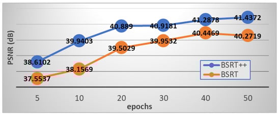 Figure 3 shows the validation accuracy of BSRT and BSRT++ according to the number of epochs. As the number of epochs increased, the validation accuracy of BSRT and BSRT++ continued to increase, and the difference in accuracy between BSRT and BSRT++ remained almost unchanged. This indicates that the models were reliably trained with good generalization ability and that BSRT++ will outperform BSRT even if the epoch number is further increased without loss of generality.