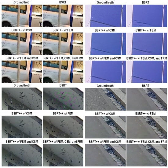 Visual comparison of SR images produced by BSRT++ with different modules.