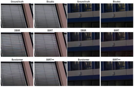All MFSR methods perform better than the SISR method. BSRT outperformed DBSR and HighRes-net with 1/2 on all metrics. However, Burstormer had higher PSNR and SSIM values than BSRT with shorter processing times. Burstormer performed worse in terms of LPIPS, indicating that the resulting SR images may have perceptually inferior image quality. On the other hand, BSRT++ generated SR results with better perceptual and quantitative image quality than BSRT or Burstormer. As mentioned in the ablation study, the processing time of BSRT++ was slightly longer than that of BSRT due to the added modules. In Figure 5, where SR images produced by different MFSR methods were shown, it is shown that DBSR and BSRT suffered from visual artifacts or distortion and failed to recover fine texture and details (e.g., the straight lines were blurred or curved and ghost lines were restored). Burstormer produced visually more plausible SR images with reduced visual artifacts and distortion. However, BSRT++ best recovered the fine texture and details of the ground truth with little visual artifacts and distortion.