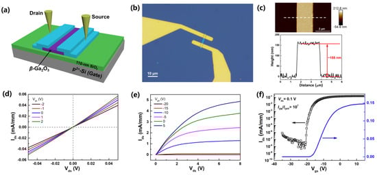 - Kim, J.; Oh, S.; Mastro, M.A.; Kim, J. Exfoliated β-Ga2O3 Nano-Belt Field-Effect Transistors for Air-Stable High Power and High Temperature Electronics. Phys. Chem. Chem. Phys. 2016, 18, 15760. [Google Scholar] [CrossRef] [PubMed]