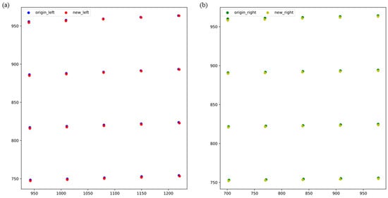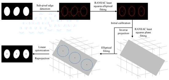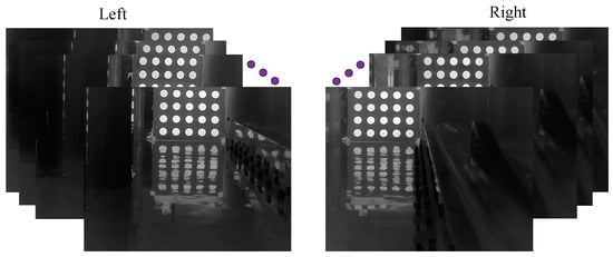 - In pursuit of improved camera calibration accuracy, the approach from reference [32] is adopted, focusing on altering the calibration board’s orientation by rotating it around the and axes, instead of moving the board linearly or rotating it around the axis. This method is complemented by the rotation of the infrared binocular camera setup to capture calibration images, ensuring that the target is captured across various positions in the combined field of view of both cameras, thus gathering an extensive set of valid calibration images. Utilizing a sub-pixel edge estimation technique for each image, the sub-pixel coordinates of the elliptical edges are extracted and subsequently refined to ascertain the central coordinates of the ellipses. The initial intrinsic and extrinsic parameters of the camera, along with the preliminary rotation and translation matrices relating the binocular camera coordinate systems, are calibrated using the planar calibration approach;