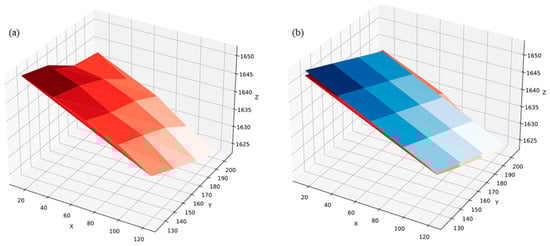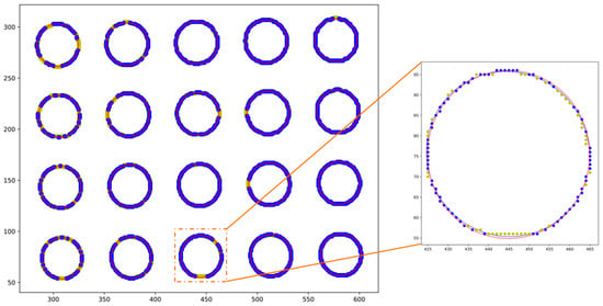 - Employing the preliminary values derived from the prior step, we calculate the coordinates in the camera coordinate system of the points where the centers of the ellipses are inversely projected into three-dimensional space, as per Equation (4). Ideally, these inverse projections fall within the plane of the actual target. Given that the initial errors from the planar calibration method are confined within acceptable limits, to approximate the true plane more accurately and minimize the effects of noise, we utilize the RANSAC to eliminate outlier points with significant deviations of the inverse projections. The equation of the virtual plane in the camera’s coordinate system is thereby established through the least squares method;