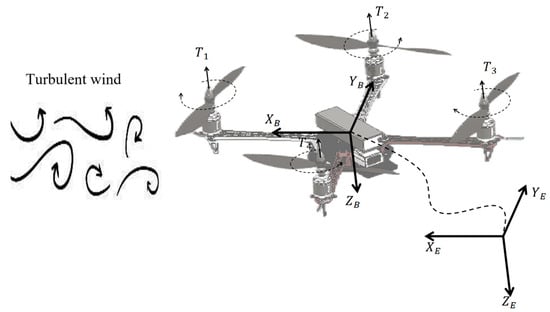 Firstly, a dynamic analysis of autonomous drones is crucial. In this paper, the dynamics model of the four-rotor UAV is taken as the analysis object, which has six degrees of freedom. As shown in Figure 1, the geodetic coordinate system and AUV coordinate system are set up to describe the motion and force of the UAV. is the geodetic coordinate system and is the body coordinate system used to describe the motion of the drone for the 3-D environment.